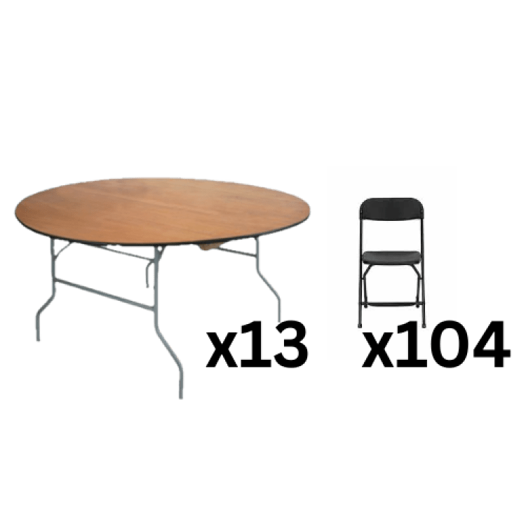 104 Guest SeatingBlack Folding Chair & 60 in Round Table Seating Package:104 Guest Seating102587999_2909181_29170721000 Comfortable and coordinated seating for up to 104 guests, perfect for keeping everyone gathered and comfortable during your event.