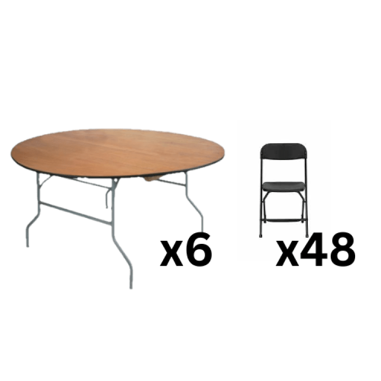 48 Guest SeatingBlack Folding Chair & 60 in Round Table Seating Package:48 Guest Seating102587999_2909181_29170441000 Comfortable, practical seating setup designed to accommodate up to 48 guests, perfect for keeping everyone gathered and comfortable during any event.