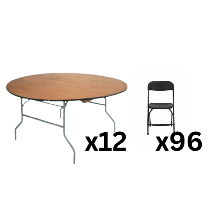 96 Guest SeatingBlack Folding Chair & 60 in Round Table Seating Package:96 Guest Seating102587999_2909181_29170701000 A complete seating setup with enough chairs and tables to comfortably accommodate up to 96 guests, perfect for parties, receptions, or large gatherings.